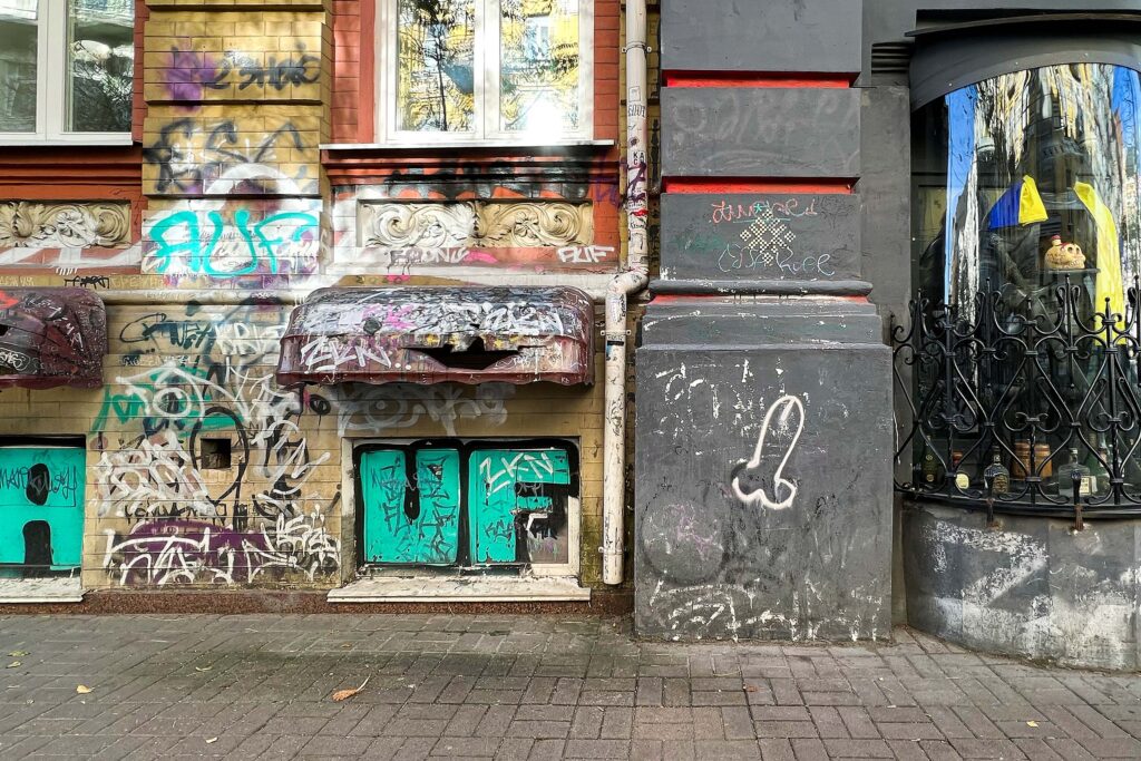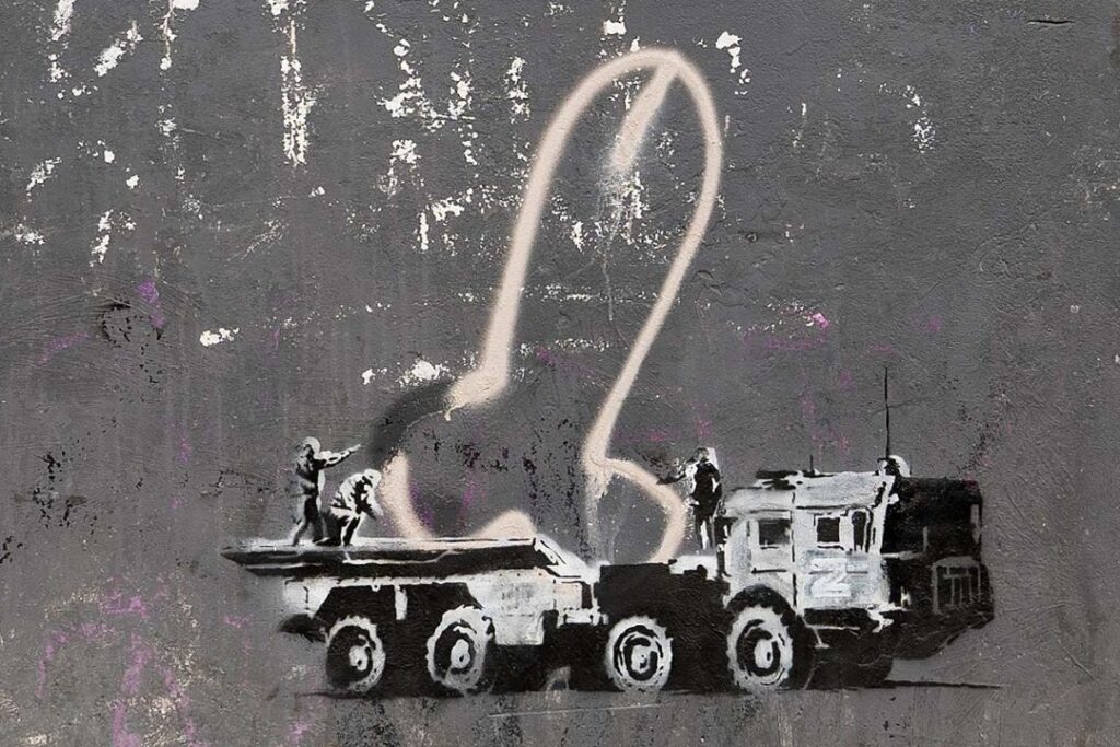 この作品は、もともと壁に描かれていた男性器の落書きに、バンクシーが追加で戦車のようなものを描き足したものです。戦車の運転席扉にはロシア軍を表す「Z」マークが描かれています。