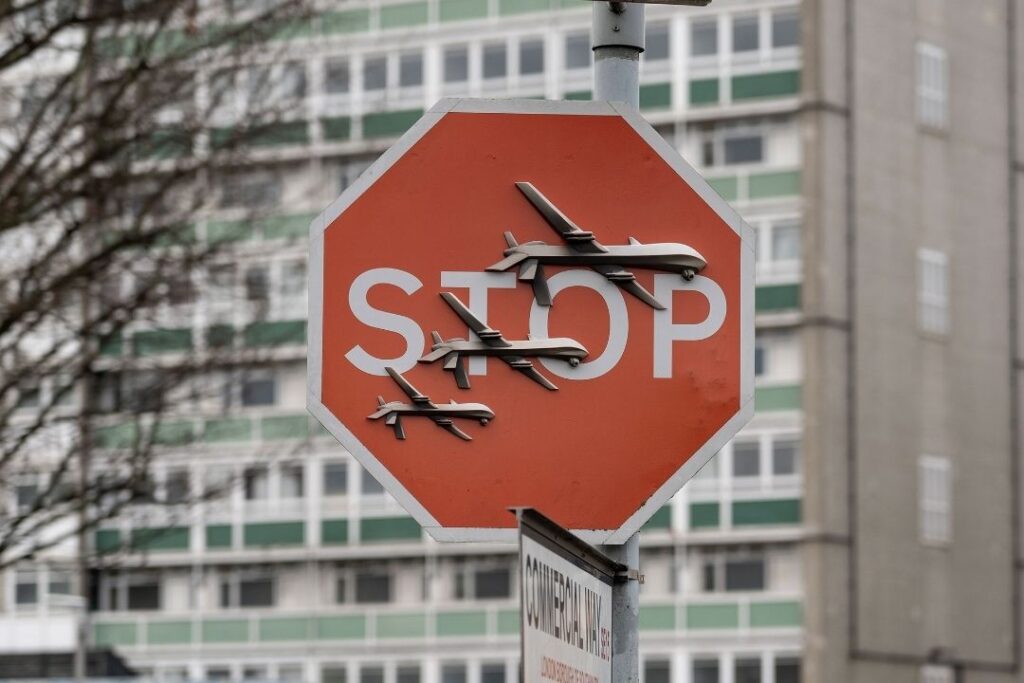 「STOP」と書かれた道路標識に3機のドローン爆撃機が描かれたものです。